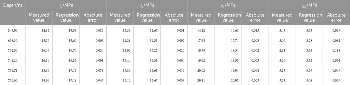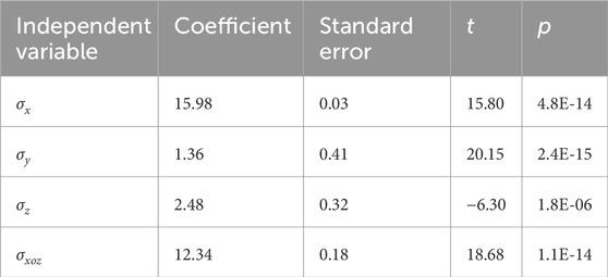 Since the in-situ stresses were expressed in the principal stress coordinate system (Table 1), but the regression analysis was performed in the XYZ computational coordinate system (Figure 3), a coordinate transformation was necessary to align the data with the analysis framework. Given the angular deviation between true north and the negative Z-axis, the stress components were converted using elastic theory, following the standard transformation Equation 8: