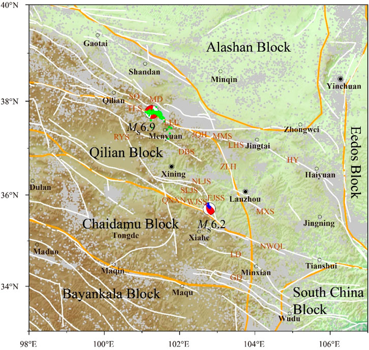 The white line represents the fault, and the orange line represents the block boundaries; Gray dots indicate the distribution of earthquakes of magnitude 2 or higher since 1970; Green dots indicate the distribution of aftershocks from the Menyuan earthquake (aftershock data from Yang et al., 2022); blue dots indicate the distribution of aftershocks from the Jishishan earthquake (aftershock data from Wang et al., 2024). TLS: Tuolaishan Fault; LLL: Lenglongling Fault; JQH: Jinqianghe Fault; MMS: Maomaoshan Fault; LHS: Laohushan Fault; HY: Haiyuan Fault; SQ: Sunan-Qilian Fault; MD: Minle-Damaying Fault; RYS: Riyueshan Fault; DBS: Dabanshan Fault; NLJS: North Lajishan Fault; EJSS: East Jishishan Fault; SLJS: South Lajishan fault; WJSS: West Jishishan Fault; NWQL: North margin of West Qinling Fault; QNXN: Qinghai Nanshan-Xunhua Nanshan Fault; ZLH: Zhuanglanghe Fault; MXS: Maxianshan Fault; LD: Lintan-Dangchang Fault; GD: Guanggaishan-Dieshan Fault;