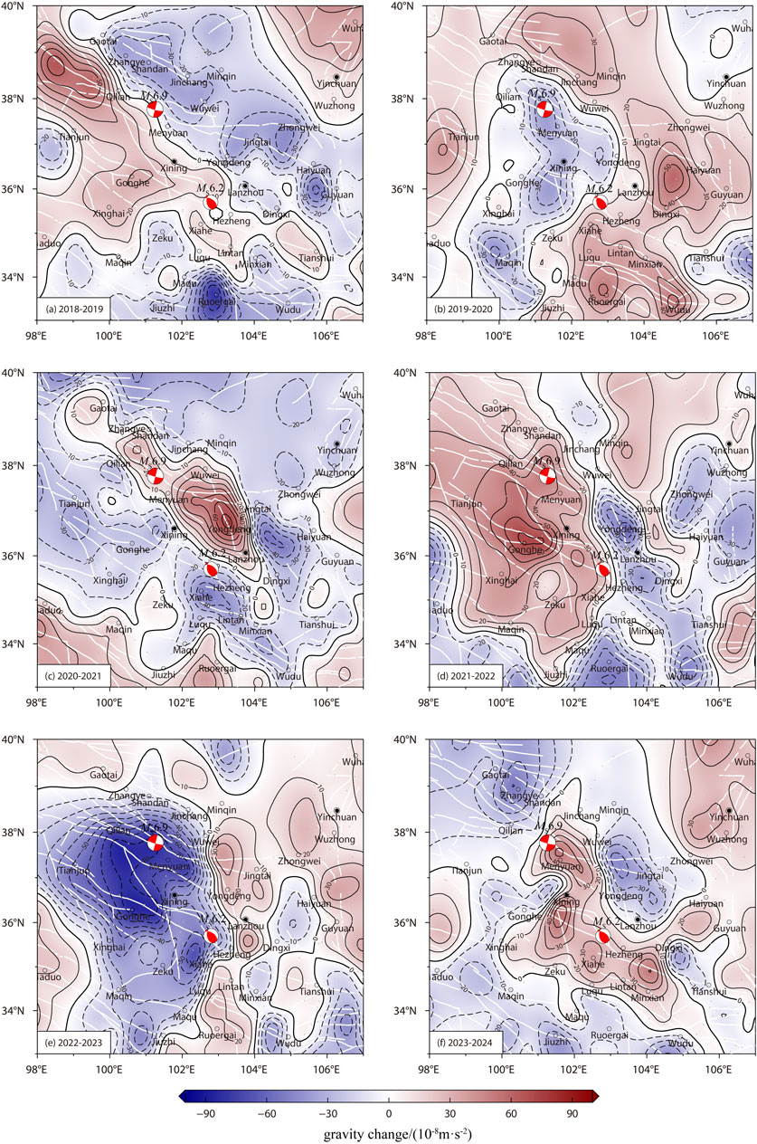 3. Gravity changes at the scales of 1 year, 2 years, and 3 years indicate that the 2022 Menyuan earthquake occurred near the GHGZ, the gravity zero-contour line, and the center of the four-quadrant area. Similarly, the 2023 Jishishan earthquake occurred on the GHGZ and the gravity zero-contour line. The GHGZ and the four-quadrant centers serve as transitional areas for material transformation, where there is intense differential movement of material increase and decrease, which can easily generate shear stress leading to rupture and triggering earthquakes. These findings are consistent with previous research results, which indicates that strong earthquakes are more likely to occur in GHGZ related to tectonic activity, in the transitions between positive and negative gravity anomaly areas, at the bends of the gravity change zero-contour line, or near the four-quadrant centers.