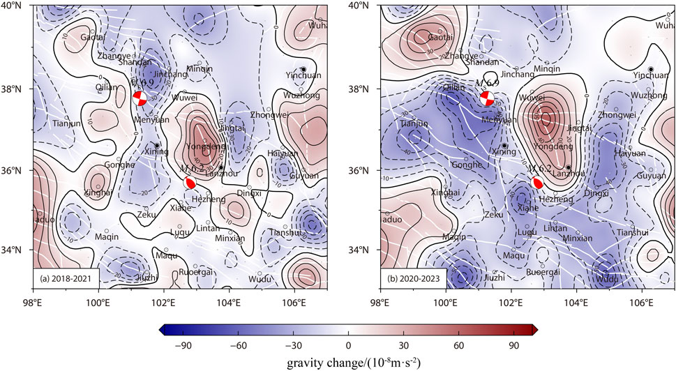 From 2018 to 2020 (Figure 4a), the gravity variation exhibited generally gentle, with variations ranging from −40 × 10−8 ms−2 ∼ +50 × 10−8 ms−2. The Qilian and Gonghe areas in Qinghai exhibited gravity change of approximately +20 × 10−8 ms−2, while the area of Shandan, Menyuan and Wuwei showed gravity change of around −30 × 10−8 ms−2. A GHGZ was formed along Qilian, Menyuan and Xining near the Tuolaishan fault. The Menyuan earthquake occurred near the bend of the GHGZ. In the southeastern Gansu region, near Xiahe and Dingxi, a gravity changes of approximately +40 × 10−8 ms−2 was observed, while the junction area of Gansu, Qinghai and Sichuan provinces (i.e., Maqu, Ruoergai area) shows gravity change of approximately −30 × 10−8 ms−2. Additionally, the GHGZ is formed along the Guanggaishan-Dieshan fault.