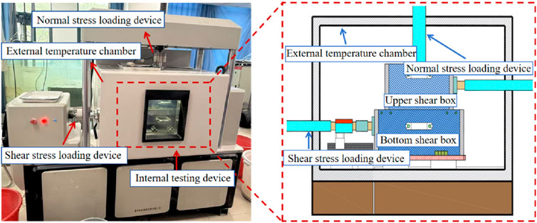 In addition to dynamic perturbations, significant temperature variations in the marine environment also significantly impact interface behavior. In the context of global climate change, the temperature fluctuation of the foundation of marine structures has been enhanced. The temperature of the topsoil can reach 60 °C–70 °C due to seasonal changes, solar radiation, tidal exchange, and seabed heat sources. The localized temperature of the foundation in the vicinity of submarine pipelines or thermal energy facilities can even reach 80 °C. Existing studies have shown that the thermal softening of thermoplastic geogrid materials, such as polypropylene, occurs at high temperatures, which results in a significant decrease in the modulus of elasticity and nodal strength of their embedded locks (Chao et al., 2024a; Chao et al., 2024b; Chen et al., 2024; Karademir and Frost, 2021). Furthermore, higher temperatures impact the viscosity and movement of water in the pores of silica sand. This effect alters the actual stress conditions and the contact structure between the particles, ultimately changing their frictional properties and shear strength. Temperature changes in the mechanical properties of geogrid materials and marine silica sand create a coupling effect that significantly influences the dynamic mechanical behavior at the interface between the sand and the geogrid (Feng et al., 2025). While initial studies focused on the impacts of temperature at the sand-geogrid interface, most experiments have been restricted to static loading and a limited temperature range, as seen in the works of Bilgin and Shah, Karademir and Frost, and Feng et al. (2025) (Bilgin and Shah, 2021; Feng et al., 2025; Karademir and Frost, 2014; 2021), They investigated the mechanochemical behavior of silica sand and geomembrane interfaces at temperatures ranging from 3 °C to 42 °C, and 21 °C–50 °C, but did not address the mechanism of interfacial evolution in a wide temperature domain, under dynamically loaded shear conditions. Investigating the dynamic mechanochemical interactions between marine silica sand and geogrid over a broad temperature range is essential.