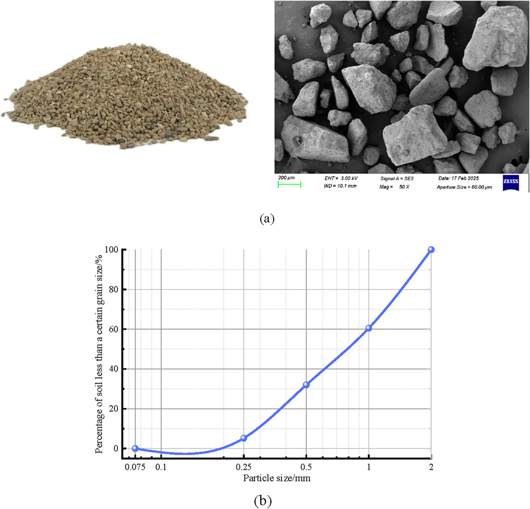 Figure 2. Marine silica sand and particle gradation curve. (a) Marine silica sand; (b) Particle gradation curve.