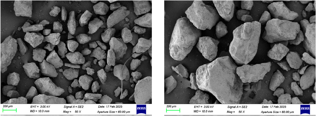 The test was designed to investigate the dynamic shear mechanical response of the interface between marine silica sand and geogrid under various temperature conditions. It was carried out using a dynamic direct shear system equipped with a temperature control function and operated in a strain control mode. In the test, the biaxial geogrid was cut to a size of 560 mm × 280 mm, and the width of the geogrid was slightly smaller than the inner width of the shear box of 30 mm to avoid the interference of lateral constraints during the shear process. The marine silica sand used has an angular particle morphology, a rough particle surface, and a wide particle size distribution from 0.075 mm to 2 mm, which determines its strong inter-particle friction, significant embedded locking effect, and sensitivity to normal stress and temperature changes. Silica sand SEM scanned image is shown in Figure 4. In order to ensure the consistency of the interfacial contact and reduce the variability of the initial filling state, the following operations were performed. The sand samples were made of marine silica sand with 10% moisture content and were filled in five layers of 24 mm thickness (120 mm total height), with each layer being compacted 16 times using a compactive effort of approximately 25 kJ/m3 to ensure a homogeneous sample. The shear loading was performed in a strain-controlled mode at a rate of 1 mm/min, and each shearing cycle involved a 6 mm displacement in the rightward direction, followed by 6 mm in the leftward direction, constituting a complete cycle, with a total of 10 cycles performed. The shear force and displacement data were automatically collected and saved by the system, which facilitated the subsequent analysis of the hysteresis behavior and energy dissipation characteristics of the interface at different temperatures.