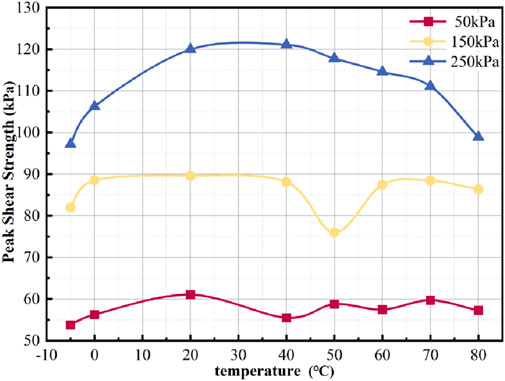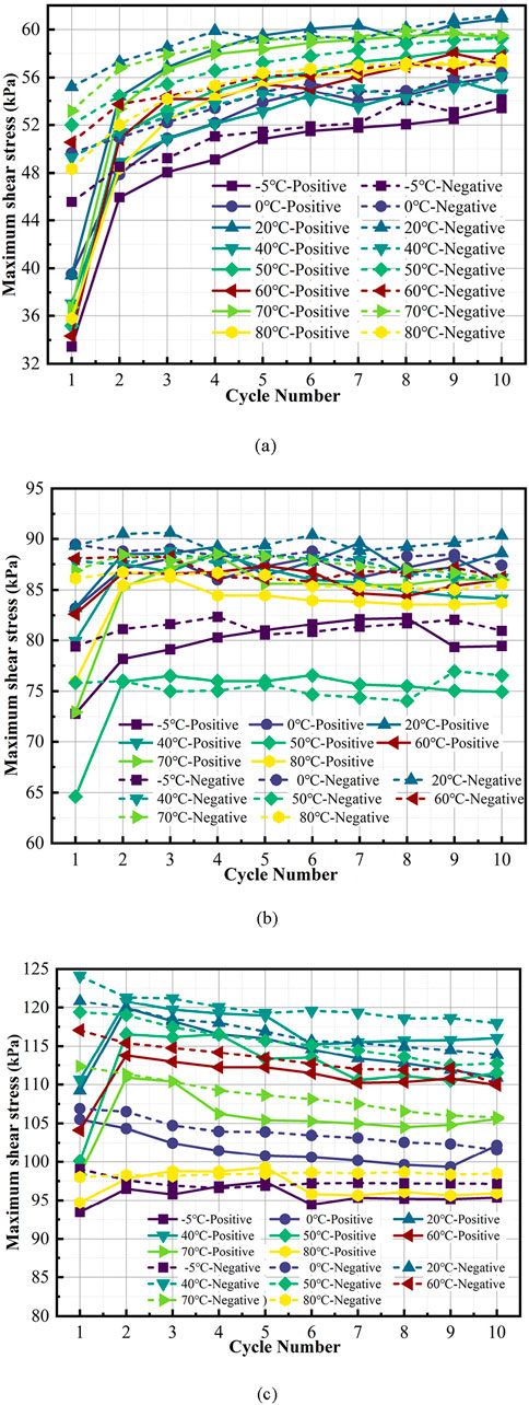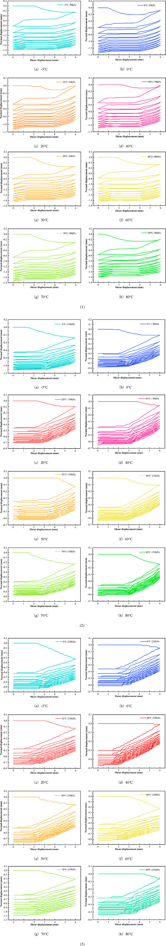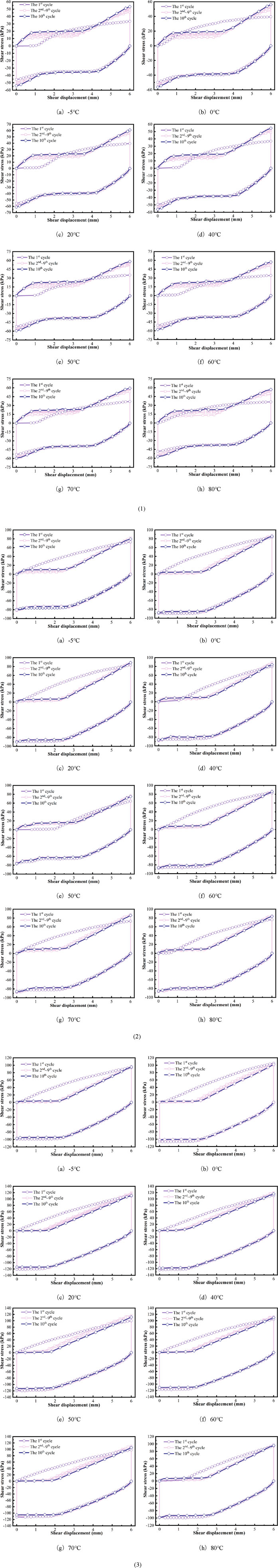 2. The peak shear strength and the positive/negative shear stress increase as temperature goes up from −5 °C to 20 °C, and the above indexes decrease when the temperature continues to increase to 80 °C. The peak shear stress increases when the temperature increases from −5 °C to 20 °C.