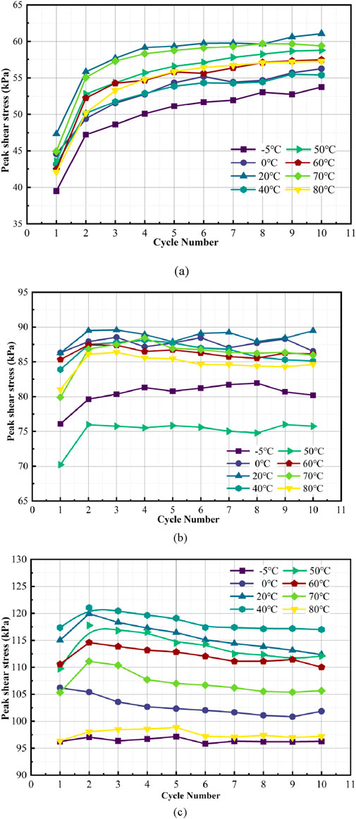 Figure 6. Peak shear stress versus cycle count curves under varying temperature conditions. (a) Normal stress 50 kPa; (b) Normal stress 150 kPa; (c) Normal stress 250 kPa.