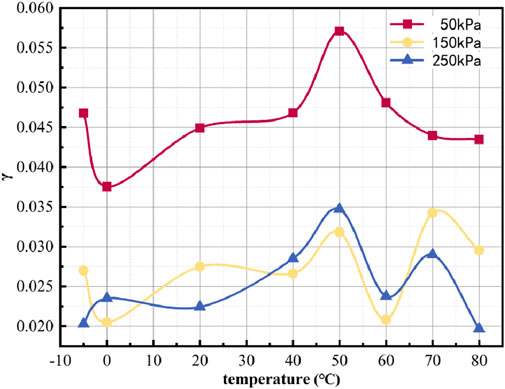 In the high-temperature range of 60 °C–80 °C, γ exhibits pronounced stress dependence. At 50 kPa, γ decreases slightly and then tends to stabilize, indicating that further heating has limited influence under low stress conditions. At 150 kPa, γ increases again and reaches a local peak around 70 °C, suggesting that the positive–negative shear stress difference is re-amplified under medium stress. At 250 kPa, γ drops sharply near 60 °C but subsequently recovers to some extent, reflecting a competition between the weakening of geogrid stiffness and the strengthening of particle interlocking at high temperatures. However, from 70 °C to 80 °C, γ decreases consistently under all stress levels, confirming that excessive heating ultimately reduces the positive–negative shear stress difference at the interface.