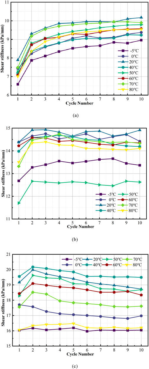 Figure 12 displays the variation in shear stiffness with cyclic loading at the marine silica sand–geogrid interface under different temperatures.