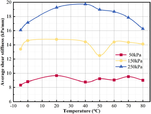 As shown in Figure 13, the average dynamic shear stiffness at the marine silica sand–geogrid interface is greatly influenced by changes in temperature. As the temperature increases from −5 °C to 20 °C, the average stiffness of the interface gradually increases, and when the temperature continues to increase to 80 °C, the overall trend of this stiffness decreases. Further analysis reveals that the interface response to temperature is significantly different under different normal stresses: the average dynamic shear stiffness is most sensitive to the temperature change when the normal stress is 250 kPa, with the most significant change; the following change is at 50 kPa, and the interface stiffness is the weakest under the 150 kPa condition. In other words, the change in stiffness is more significant at higher normal stresses for the same range of temperature changes. Although the temperature difference from normal to high temperatures is larger than that from normal to low temperatures, the decrease of the interface stiffness during the warming process is more minor for each normal stress condition, which indicates that the weakening effect of low temperatures on the interface stiffness is more pronounced compared with that of high temperatures.
