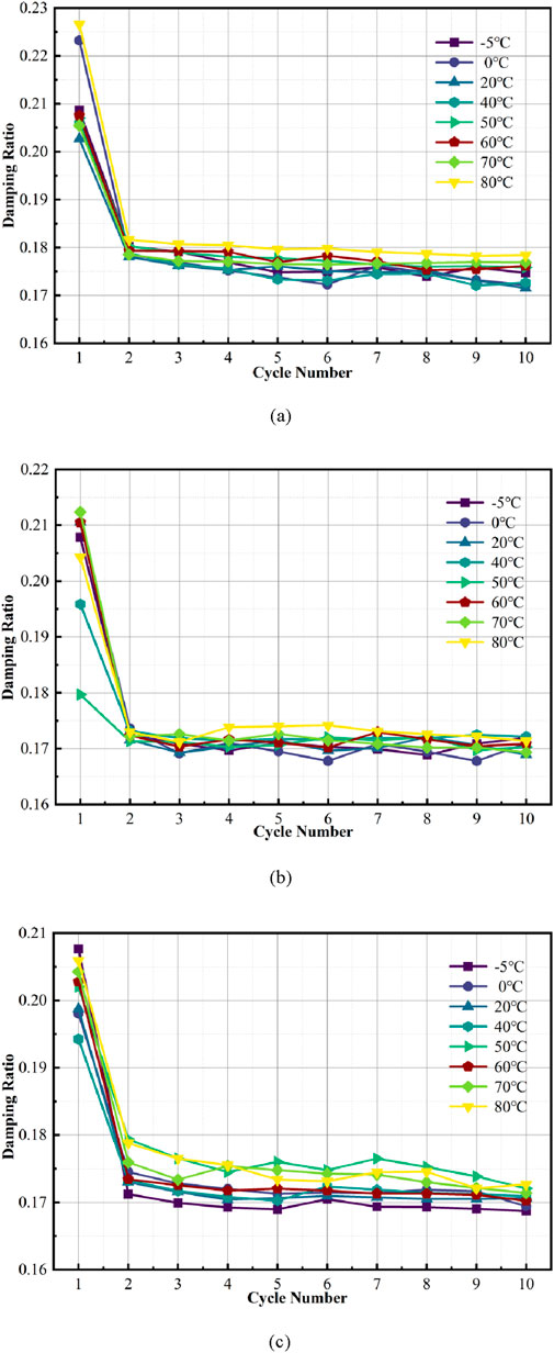 Figure 14. The relationship curves between the damping ratio and the number of cycles. (a) Normal stress 50 kPa; (b) Normal stress 150 kPa; (c) Normal stress 250 kPa.