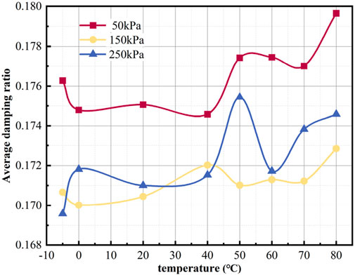 As seen in Figure 15, temperature has a significant effect on the average damping ratio at the marine silica sand-geogrid interface. In two specific temperature intervals (0 °C–50 °C and 70 °C–80 °C), the interface average damping ratio generally tends to increase with increasing temperature, which indicates that warming helps to improve the energy dissipation capacity of the interface. A further reduction in temperature from 0 °C to −5 °C leads to significant differences in the damping ratio response for different normal stress levels: the average damping ratio increases for both the 50 and 150 kPa normal stress conditions, and decreases for the 250 kPa condition. This suggests that under the combined effect of low temperature and low normal stress, the interface is more likely to reach the hysteretic regression steady state and exhibits a stronger energy dissipation ability. However, with an increase in normal stress, the effect of low temperature gradually diminishes and can even reverse the damping ability. Similarly, in the high-temperature interval from 50 °C to 80 °C, the change in damping ratio shows a more complex trend: under 50 kPa and 150 kPa normal stress, the average damping ratio changes less in the first period and then rises significantly, while under 250 kPa, the damping ratio decreases and then rises. This indicates that the activation of the interface state by temperature increase is more evident under the high temperature-low normal stress condition, but when the normal stress is higher, the high temperature may, on the contrary, trigger the behaviors of particle slippage and grid softening, which leads to the reduction of the energy dissipation capacity for a while, and then the enhancement of energy dissipation capacity after the completion of the structural adjustments.