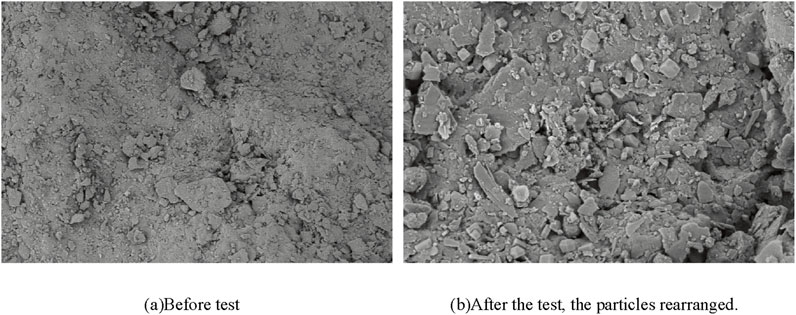Figure 18. SEM images of silica sand before and after the experiment. (a) Before test. (b) After the test, the particles rearranged.