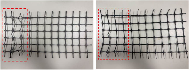 A significant nonlinearity also characterizes the influence of temperature fluctuations on the interfacial shear behavior. During the warming process from −5 °C to 20 °C, the peak interfacial shear stress, the maximum positive/negative shear stress, and the dynamic shear stiffness all showed an upward trend. At this stage, the temperature increase reduces the pore water viscosity between sand particles, which is conducive to particle rearrangement and contact reconstruction (See Figure 18). The reduction in pore water viscosity and its subsequent effect on inter-particle friction and effective stress is a key coupled mechanism, the importance of which is supported by thermo-poroelastic modeling in other geotechnical contexts (Pirhadi et al., 2025).At the same time, the grating material maintains a high modulus of elasticity and nodal stiffness, which enhances the embedded locking and shear capacity of the interface. 20 °C can be regarded as the threshold for the thermal enhancement effect. When the temperature is further increased to 80 °C, the interface strength and stiffness decrease. This is because the polypropylene grating in the high temperature occurred significant thermal softening, its modulus of elasticity and node deformation resistance decreased, cannot effectively support the embedded sand particles to form a stable lock (See Figure 19). At the same time, high temperature exacerbated the tendency of inter-particle slippage, the interface resistance to decline, the embedded locking structure into the slippage, and the interface of the overall shear performance degradation.