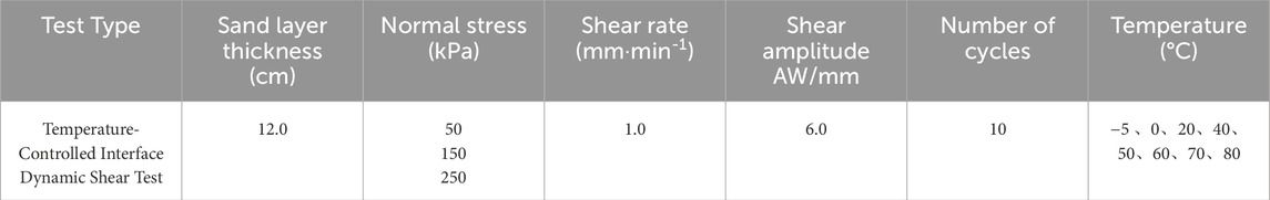 The interfacial mechanical behavior of marine silica sand and geogrid directly affects the stability and durability of marine fill bodies and reinforced structures, and the significant influence of temperature on mechanical properties is a critical concern across various geotechnical engineering applications, from reinforced soils to wellbore integrity (Kianoush et al., 2024).This paper, based on the self-developed soil-geosynthetics interface temperature-controlled direct shear test system, systematically studied the dynamic shear mechanical properties of the interface between marine silica sand (particle size of 0.075–2 mm) and bidirectional geogrid in a wide range of temperatures (−5 °C to 80 °C) and multilevel normal stress (50–250 kPa) coupling effect, which fills the lack of experimental data on temperature-influenced mechanisms in existing studies. The results show that there are significant differences in the interfacial cyclic shear response mechanisms under different temperatures and normal stresses, as well as the sensitivity of interfacial shear strength to temperature changes with varying normal stress.