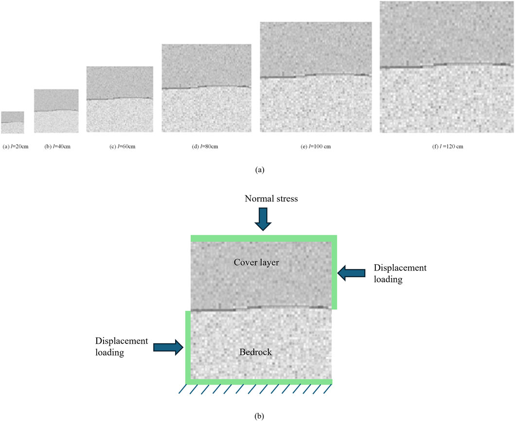 To systematically reveal the coupled influence mechanism of normal stress and size effect on the shear strength and failure mode of the cover interface, this paper conducted a two-dimensional direct shear simulation study on the overburden-foundation interface-bedrock combination based on the RFPA. The article constructs a shear strength prediction model based on size effect, proposes a method for solving the characteristic size, and quantifies the regulatory effect of normal stress on the stability of shear response. To investigate the size effect of the cover interface on its shear behavior, this paper constructs six two-dimensional numerical models with different sizes. The interface lengths are 20 cm, 40 cm, 60 cm, 80 cm, 100 cm, and 120 cm, as shown in Figure 1a. The model consists of three parts: the upper part is the cover layer, the middle part is the cover interface, and the lower part is the bedrock layer, as shown in Figure 1b.