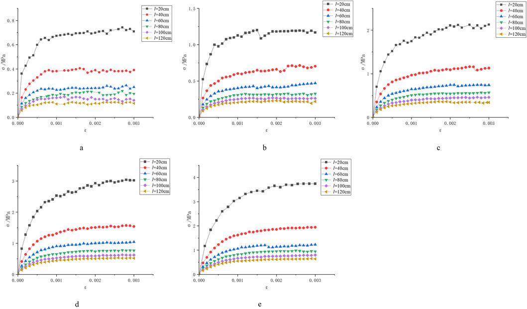 Figure 2. Stress strain curves of rocks at different sizes. (a) 0.5 MPa. (b) 1 MPa. (c) 2MPa. (d) 3 MPa. (e) 4MPa.