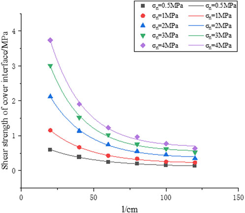 In the formula: τ (L) is the shear strength of the cover interface with a size of l, unit: MPa; σn is the normal stress, unit: MPa; l is the size of the cover interface, unit: cm.