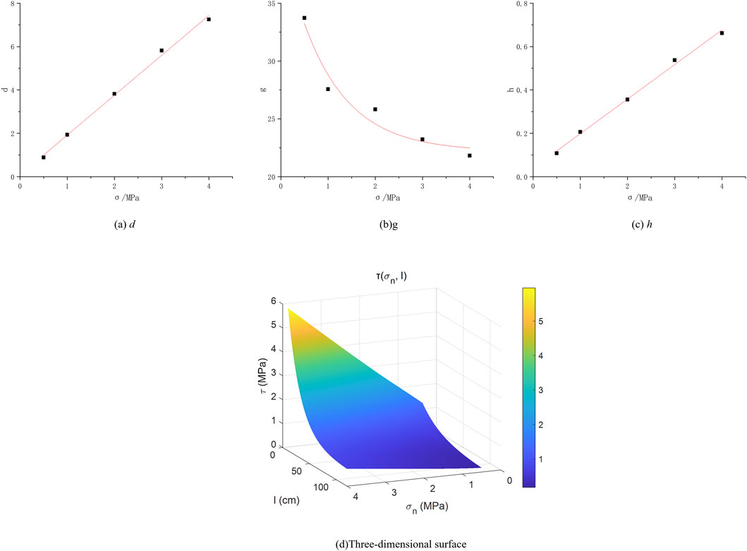 In the formula: τ (L) is the shear strength of the cover interface with a size of l, unit: MPa; l is the size of the cover interface, unit: cm; h is the residual shear strength, d is the strength increment, which increases with the increase of normal stress, and g is the size effect attenuation coefficient, which decreases with the increase of normal stress.
