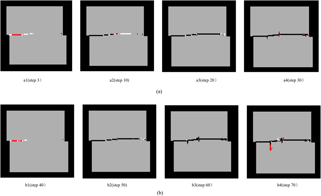 Figures 5a show the formation and development of cracks at the interface size of 20 cm and 60 cm, respectively, under a normal stress of 1 MPa. When the size of the cover interface is 20 cm, local white small cracks appear at the front end of the cover interface, accompanied by a small amount of acoustic emission (Figure 5a1); As the shear continues, local small cracks continue to develop along the interface shear direction and continue to develop towards the right end. At this point, a certain degree of shear failure occurs on the left side of the cover interface (Figure 5a2); In the middle stage of shearing, the crack approaches the interface and is fully penetrated, with secondary cracks in some areas, causing a certain degree of wear at the contact area between the upper and lower blocks of the cover interface, and showing an “end effect” on the right side (Figure 5a3); In the later stage of shearing, the crack fully penetrated and the interface was basically completely destroyed, resulting in complete shear slip (Figure 5a4).