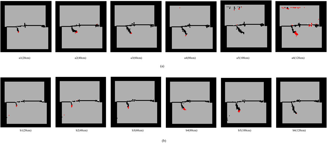 To analyze the failure law during the shear process of the base cover interface, acoustic emission images of 20 cm and 60 cm models with different shear steps were selected under normal stress of 1 MPa, as shown in Figure 5, where a1, a2, a3, a4 and b1, b2, b3, b4 represent step sizes of 3, 10, 20, 30 and 40, 50, 60, 70, respectively.