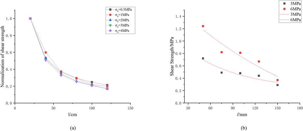 To verify the universal applicability of Formula 6, we cited the shear strength data under different sizes and normal stresses in Chen et al. (2021). The normal stress values were 3 MPa and 6 MPa, respectively, and the size values were 50 mm, 75 mm, 100 mm, 125 mm, and 150 mm. The specific data are shown in Table 6, and corresponding scatter plots and fitting curves are plotted in Figure 8b.