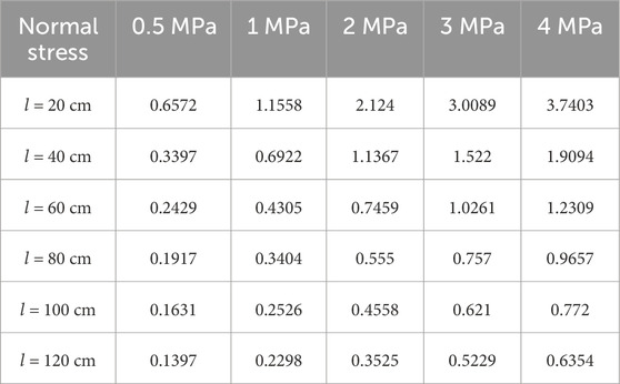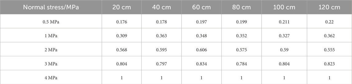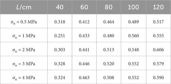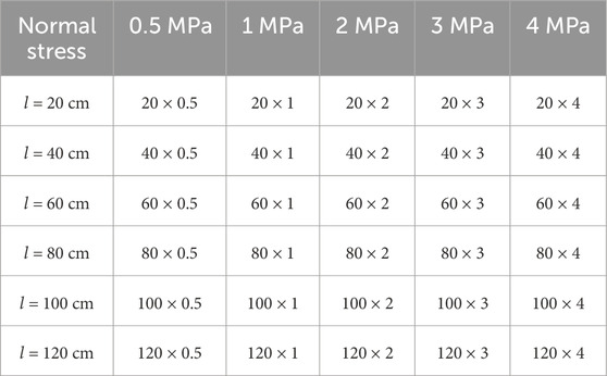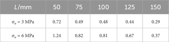 Equation 10 exhibits high fitting accuracy (R2 > 0.997) within the size range of 20–120 cm and the normal stress interval of 0.5–4 MPa, making it suitable for interface analysis where weak plane-dominated shear failure occurs. The applicable prerequisites include: (1) the interface strength is significantly lower than that of the surrounding rock mass; (2) the loading condition is two-dimensional direct shear; (3) the interface roughness and material parameters are basically consistent with the settings of this study. If used in other working conditions or formation conditions, the model coefficients should be revised based on actual measured parameters.