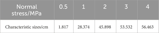 Based on Formulas 12–14, calculate the characteristic sizes values of structural planes with normal stresses of 0.5 MPa, 1 MPa, 2 MPa, 3 MPa, and 4 MPa, as shown in Table 4, and plot their fitting curves with normal stress, as shown in Figure 7b.