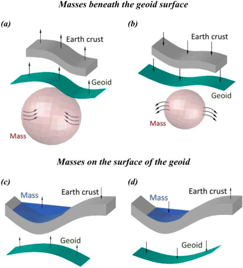 Figure 1. Relationship between mass transports within the Earth’s system and temporal variations of geoid heights. (a) Increase in mass below the geoid surface, (b) decrease in mass below the geoid surface, (c) increase in mass at the Earth’s surface, (d) decrease in mass at the Earth’s surface (after Godah et al., 2018a; Godah et al., 2020; Szelachowska et al., 2022).