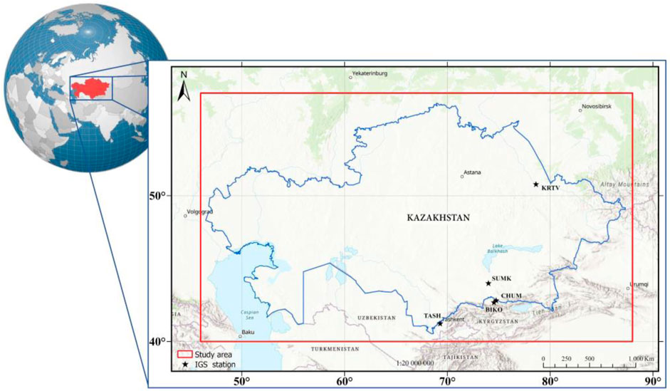 The area of Kazakhstan (40° ≤ latitudes ≤ 56° and 46° ≤ longitudes ≤ 88°) is located in the core of Eurasia with a territorial area of 2.72 km2 × 106 km2 (Figure 2). This region consists mainly of plains, lowlands, and hills, with fewer mountains, rivers, and lakes. The plains are mostly located in the west, north, and southwest, while the central area is dominated by the Kazakh Hills. To the east and southeast lie the Altai and Tianshan Mountains. Between the Caspian Sea and the Tianshan Mountains, farmland, grasslands, and deserts extend from north to south. Farmlands are concentrated in the northern plains, eastern areas, and eastern foothills, while grasslands are found primarily in the central, northeastern, and northwestern plains. Deserts are mainly located in the central and southern regions. Forests are relatively scarce, mainly situated in the Altai Mountains in the east, the Tianshan Mountains in the south, and the hilly and mountainous areas in the north (Kraemer et al., 2015; Urazaliyev et al., 2024). The spatiotemporal variations in the gravitational field within this area can result primarily from the dynamic redistribution of mass within the Earth’s system. Key contributors to these mass redistribution include declining Caspian Sea levels, ongoing degradation of the Aral Sea, accelerated melting of glaciers in the Tien Shan mountains, and persistent tectonic activity. Nonetheless, spatiotemporal variations of geoid heights in this area remain uninvestigated. In 2024, Kazakhstan experienced extreme hydrological events, such as large-scale flooding, anomalously high precipitation levels, and heightened tectonic activity in adjacent regions (e.g., Van Dijk et al., 2025). Such extreme events can induce significant temporal variations of the Earth’s gravitational field and geoid heights within the area of Kazakhstan.