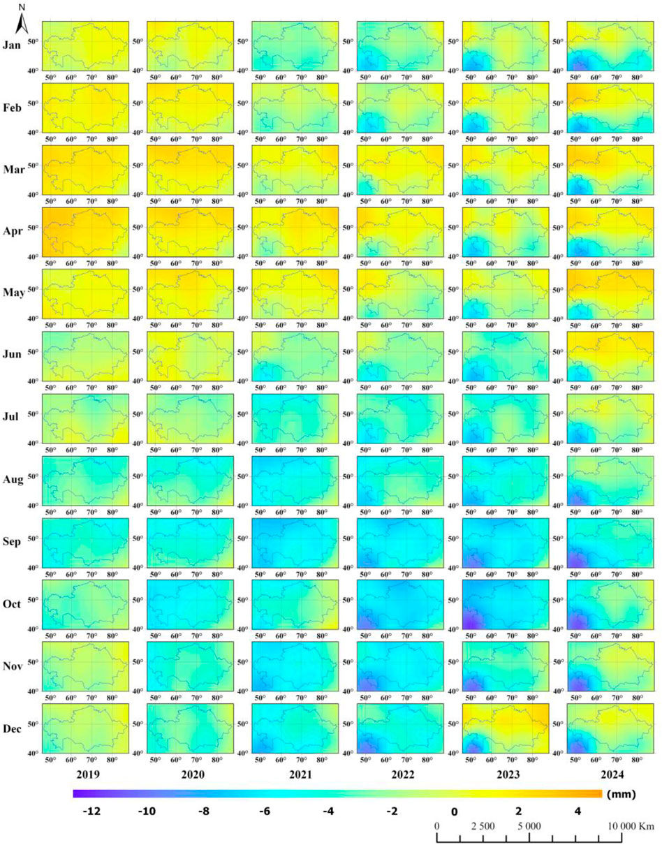 Figure 3. Maps of temporal variations of geoid heights (ΔN) for the period January 2019 to December 2024 over the territory of Kazakhstan.