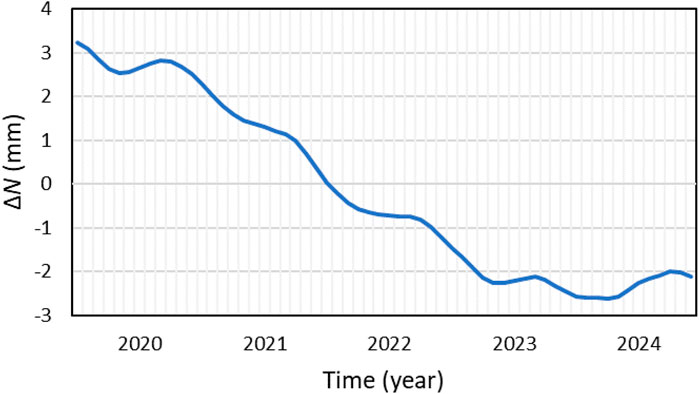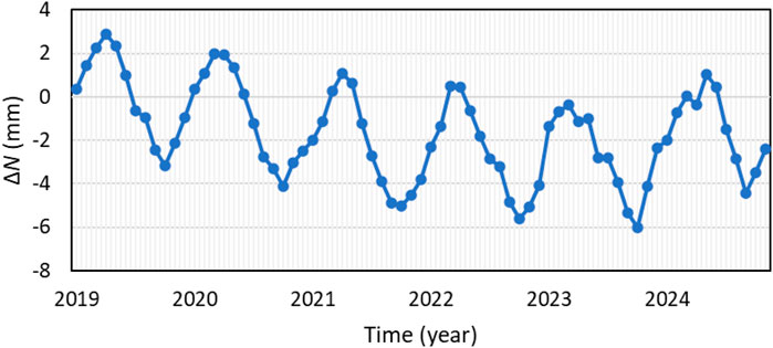 Maps of ΔN for January 2019–December 2024 over Kazakhstan are shown in Figure 3. It should be mentioned that these ΔN were determined using the average SHCs for the first year of this investigation (i.e., year 2019). The time series of the mean values of ΔN over the whole area of Kazakhstan is illustrated in Figure 4.