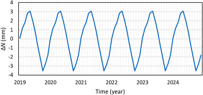 Figure 5. Seasonal component of temporal variations of geoid heights (ΔN) in Kazakhstan from 2019 to 2024.