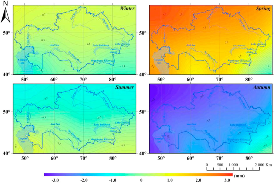 Figure 5 shows seasonal variations of geoid heights over Kazakhstan for the period 2019–2024, based on data from the GRACE–FO data. The average of these seasonal variations is illustrated in Figure 6. Figures 5, 6 reveal that the amplitude of ΔN over Kazakhstan over the period investigated is approximately 3.5 mm. It confirms the results provided in Figures 3, 4 as the maximum values of ΔN are recorded in the spring (March–May), and the minimum ones in the fall (September–November), which reflects the influence of seasonal processes associated with the redistribution of hydrological mass in the region. The estimated ΔN amplitude in Kazakhstan is consistent with values reported over the Ob River basin, which encompasses parts of Kazakhstan (Godah et al., 2020). It also falls within the range of ΔN amplitudes observed in different regions around the world. For instance, Godah et al. (2017b) reported ΔN dispersions (maximum–minimum) ranging from 4 mm to 9.6 mm across Central Europe. On a broader scale, Godah et al. (2020) showed that dispersion of ΔN can vary significantly among major river basins, with extremes such as 30 mm over the Amazon River basin in South America and 7 mm over the Orange River basin in South Africa. In contrast, Zhang et al. (2024) estimated an annual ΔN amplitude of 1.9 ± 0.02 mm over the Mississippi River basin in North America. Figure 5 shows the average seasonal variations of the geoid in Kazakhstan for the period from 2019 to 2024. It illustrated that in fall, geoid heights are decreasing in the northern and central regions, which is associated with the accumulation of snow cover and soil freezing. At the same time, geoid heights over the Caspian Sea remain relatively stable. The most significant change occurs in spring–geoid heights rise in the areas of large rivers (Irtysh, Syr Darya, Ural) due to frequent floods caused by melting snow and glaciers in the Altai and Tien Shan mountains. This leads to an increase in the hydrological mass and a redistribution of the load on the lithosphere. In summer, the geoid height stabilizes. In the southern regions, a slight decrease is observed, associated with a decrease in river runoff and evaporation. At the same time, the level of the Caspian Sea also decreases, which is reflected in negative changes in the geoid height. In autumn, the geoid height begins to gradually decrease, caused by the reduction of water reserves in rivers and underground waters. During this period, precipitation partially compensates for the losses.