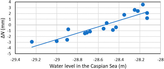 Figure 8. The relation between the change of the water level in the Caspian Sea and temporal variations of geoid heights (ΔN).