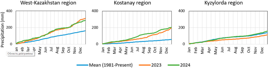 The analysis of precipitation for the years 2023–2024 in the West Kazakhstan, Kostanay, and Kyzylorda regions, as shown in Figure 9, indicates a notable increase compared to the long-term average. By the end of 2023, precipitation in the Western region of Kazakhstan reached approximately 300 mm, which is about 250 mm above the average level. In the Kostanay region, precipitation is expected to be around 200 mm by the end of the year, significantly higher than the average of approximately 130 mm.