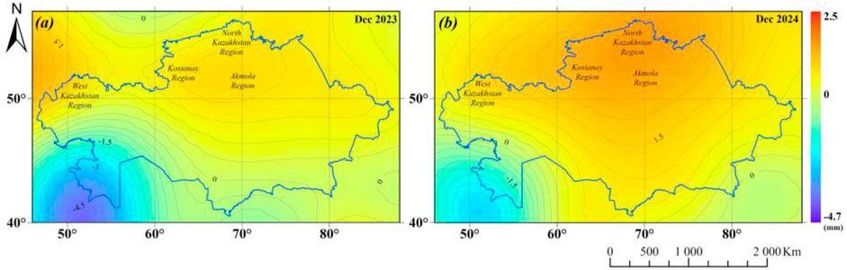 Figure 10 shows ΔN in December 2023 and 2024. It indicates an increase in geoid heights in the western region (West Kazakhstan) of up to 1.70 mm and in the northern regions (Akmola, Kostanay, and North Kazakhstan) of up to 1.35 mm. This can be ascribed to an abnormal accumulation of snow mass. Such changes can be associated with increased seasonal sedimentation, which resulted in a significant rise in the water mass changes. These changes had a direct impact on the hydrological regime in 2024, becoming one of the primary causes of spring floods. The rapid melting of snow cover in these areas caused a significant increase in surface runoff, leading to rising river levels and flooding in low-lying areas.