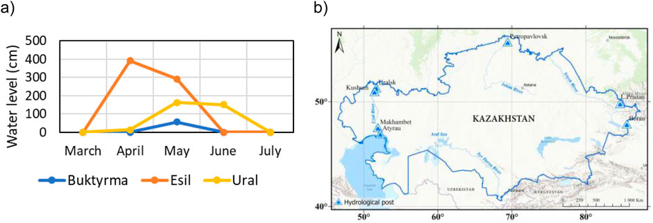 Figure 11. (a) A record of exceeding the critical mark of the water level at the hydrographic posts of the rivers Yesil, Ural, Irtysh, and (b) the location of hydrographic posts.