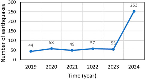 One of the most significant factors influencing the geoid dynamics in 2024, particularly in the southern and southeastern regions of Kazakhstan, could be a rapid increase in seismic activity. According to the USGS Earthquake Catalog (https://earthquake.usgs.gov/), the number of earthquakes with a magnitude greater than 4.5 within a radius of 300 km from the borders of Kazakhstan in 2024 increased fivefold compared to previous years, which emphasizes the scale of the ongoing tectonic processes, as shown in Figure 12.