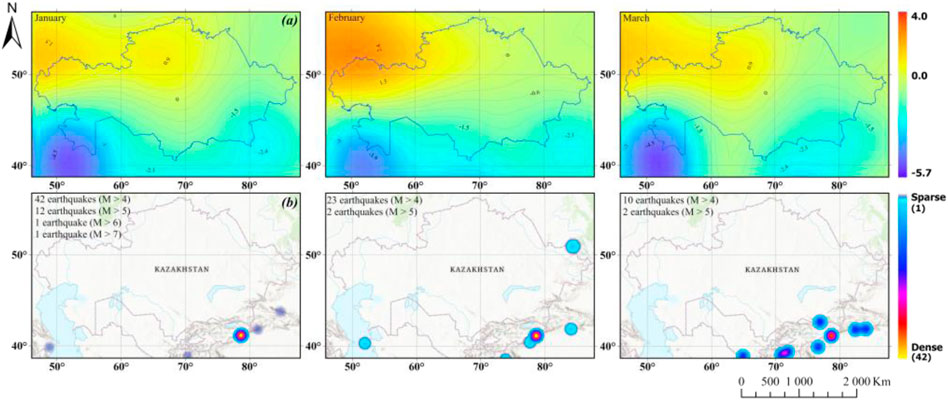 Figure 13. (a) Maps of temporal variations of geoid heights from January to March 2024 and (b) the density of earthquake epicenters with a magnitude greater than 4.5.