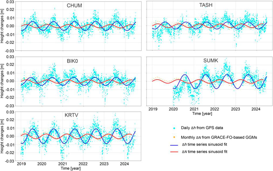 Figure 14. Daily ellipsoidal height changes (Δh) from GPS data and monthly variations of geoid height (ΔN) from GRACE–FO–based GGMs as well as their sinusoidal fit at GPS CORS: CHUM, TASH, BIK0, SUMK and KRTV.