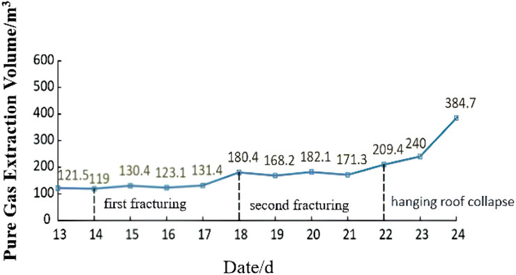 Before hydraulic fracturing, the air supply volume of the working face was increased from 1140 m3/min to 1800 m3/min based on the relationship between gas emission and ventilation negative pressure. According to the measured gas data from the 143 working face and the gas beam pipe in the goaf, the following findings were obtained: