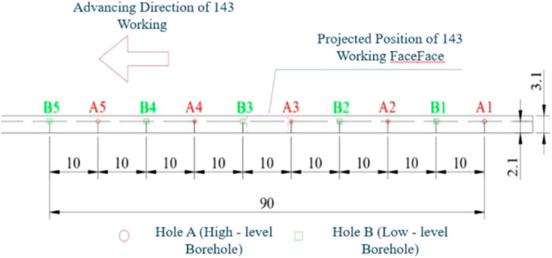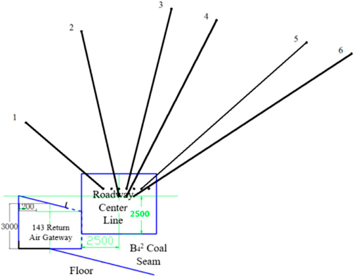 The boreholes are located in the return airway of the 143 working face, with the following design parameters.