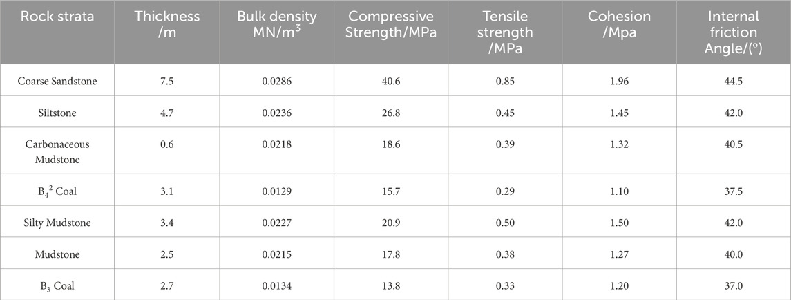 The results of gas grade identification indicate that for the B42 coal seam in Donggou Coal Mine, the relative gas emission is 6.59 m3/t, and the absolute gas emission is 14.56 m3/min. The relative carbon dioxide emission is 1.17 m3/t, with an absolute carbon dioxide emission of 2.59 m3/min. Specifically, for the coal mining face, the relative gas emission is 2.78 m3/t, and the absolute gas emission is 5.88 m3/min, which exceeds 5 m3/min. The maximum absolute gas emission of the excavation face is 2.94 m3/min. In accordance with Article nine of the Measures for the Identification of Gas Grades (Coal Safety Supervision and Technical Equipment [2018] No. 9), Donggou Coal Mine is classified as a high-gas mine. The physical and mechanical parameters of the roof and floor are presented in Table 1.