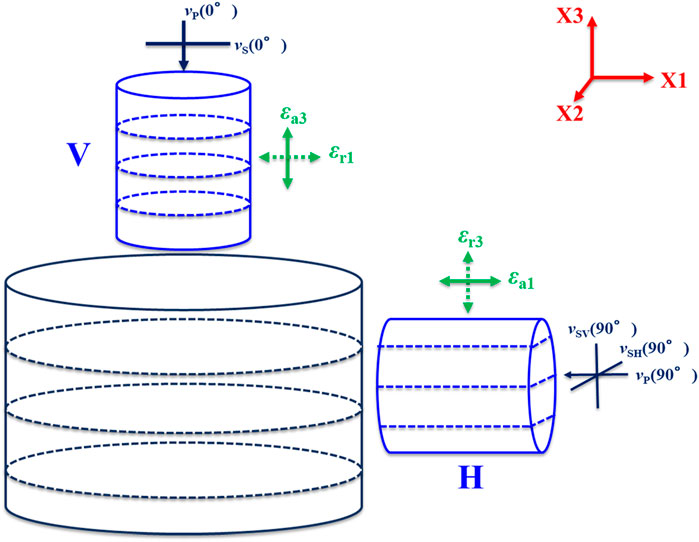 Figure 1. Coring principle from a full-diameter shale sample with a transversely isotropic structure. In the X1/X2/X3 coordinate system, strains and velocities measured on vertical (V) and horizontal (H) specimens are shown.