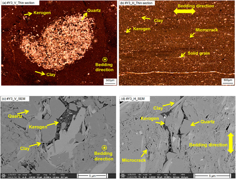Figure 2. Thin-section images for (a) the vertical and (b) the horizontal #Y3 shale sample; SEM images for (c) the vertical and (d) the horizontal #Y3 shale sample. Note: both thin-section and SEM images are taken from the top surface of cylindrical samples.
