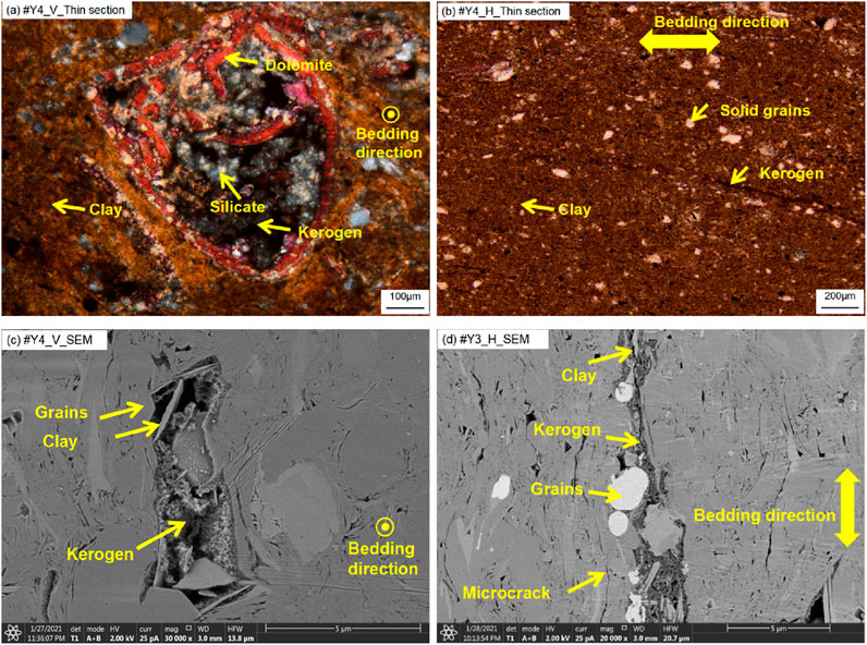 Figure 3. Thin-section images for (a) the vertical and (b) the horizontal #Y4 shale sample; SEM images for (c) the vertical and (d) the horizontal #Y4 shale sample. Note: both thin-section and SEM images are taken from the top surface of cylindrical samples.