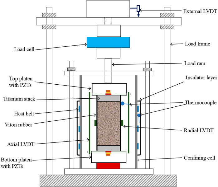 We employ a servo-controlled triaxial testing system (AutoLab 1500, manufactured by the New England Research) to conduct dynamic and static tests simultaneously at various confining pressures and temperatures. As shown in Figure 4, the experimental setup is composed of a stress–strain measurement system, an ultrasonic velocity measurement system, and a temperature measurement system (Wang et al., 2021b).
