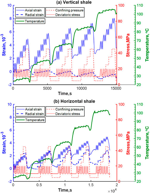 Organic shales are anisotropic, with a finely laminated texture with clay platelets, microcracks, and lenticular kerogen particles (Vernik and Nur, 1992; Dewhurst and Siggins, 2006; Zhao et al., 2016; Ramos et al., 2019). The presence of laminae or beddings in shales would result in pronounced anisotropy in both mechanical and thermal behaviors. Meléndez-Martínez and Schmitt (2016) measured anisotropic Young’s moduli of four shale samples at confining pressures up to 60 MPa and concluded that the Young’s modulus perpendicular to the bedding plane is more pressure-sensitive than that parallel to the bedding plane. With the increased confining pressure, the anisotropy degree gradually decreases to an asymptotic value, which defines the intrinsic anisotropy (Vernik, 2016). Additionally, some previous studies have demonstrated that the thermal expansion of rocks is anisotropic due to different mineral compositions and the presence of bedding planes (Somerton, 1992; Ding et al., 2020; Gabova et al., 2020). One consensus is that the axial expansion coefficient of samples with horizontal foliation is larger than that of samples with vertical foliation (Zhang et al., 2015; Herrmann et al., 2018; Gabova et al., 2020). These unequal expansions can be expected to cause microcracks preferentially in the direction along bedding planes (Zhou et al., 2016). As a result, due to the complex structure of anisotropic shales, the anisotropy degree will inevitably vary with the applied confining pressure and temperature.