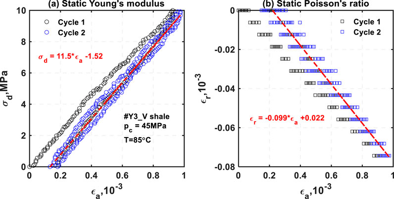 Figure 6. Methods for deriving static Young’s modulus (a) and Poisson’s ratio (b), respectively, taking #Y3_V shale at the confining pressure of 45 MPa and the temperature of 85 °C as the example. The slopes of linearly fitting ε a-σ d and ε a-ε r curves in cycle 2 are considered to be the static Young’s modulus and Poisson’s ratio.