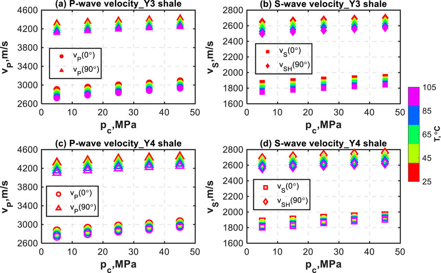 Figure 7. P- and S-wave velocities (v P (0°), v P (90°), v S (0°), and v SH(90°)) as functions of the confining pressure (p c) and temperature (T) for (a) and (b) #Y3 shale and (c) and (d) #Y4 shale.