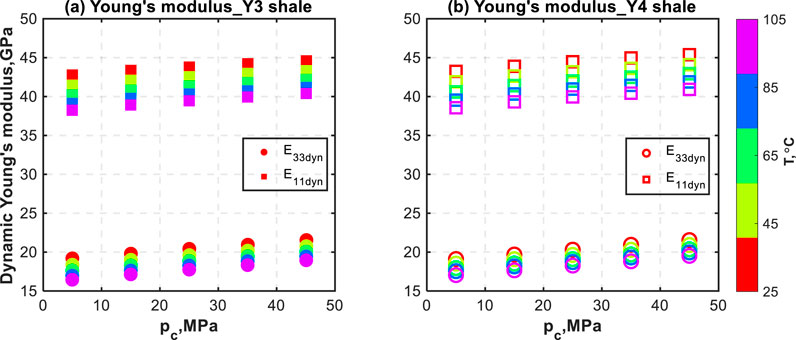 Figure 8. Two dynamic Young’s moduli (E 33dyn, E 11dyn) as functions of the confining pressure (p c) and temperature (T) for (a) #Y3 and (b) #Y4 shales.